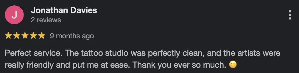 You will be warmly welcomed into our studio, where we look forward to discussing ideas and options for your tattoo.